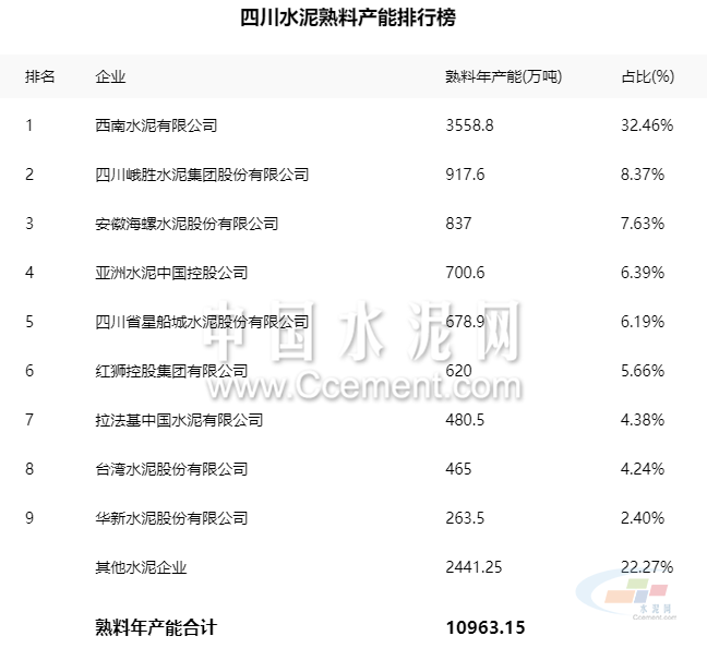 根據(jù)中國(guó)水泥網(wǎng)發(fā)布的2020中國(guó)水泥熟料產(chǎn)能百?gòu)?qiáng)榜之四川省熟料產(chǎn)能得知,截至2020年,四川水泥熟料年產(chǎn)能合計(jì)10963.15萬(wàn)噸,其中,西南水泥占比最大為32.46%。